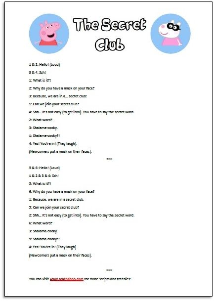 For this story, you can watch the Peppa Pig The Secret Club episode. While watching, remember the video watching steps: First, watch the video without stopping, Then watch it again, but this time stop the video to ask questions to the students and for the last time, watch it again and when you stop it ask students to repeat the sentences (So they get used to hear and say the lines of the script).