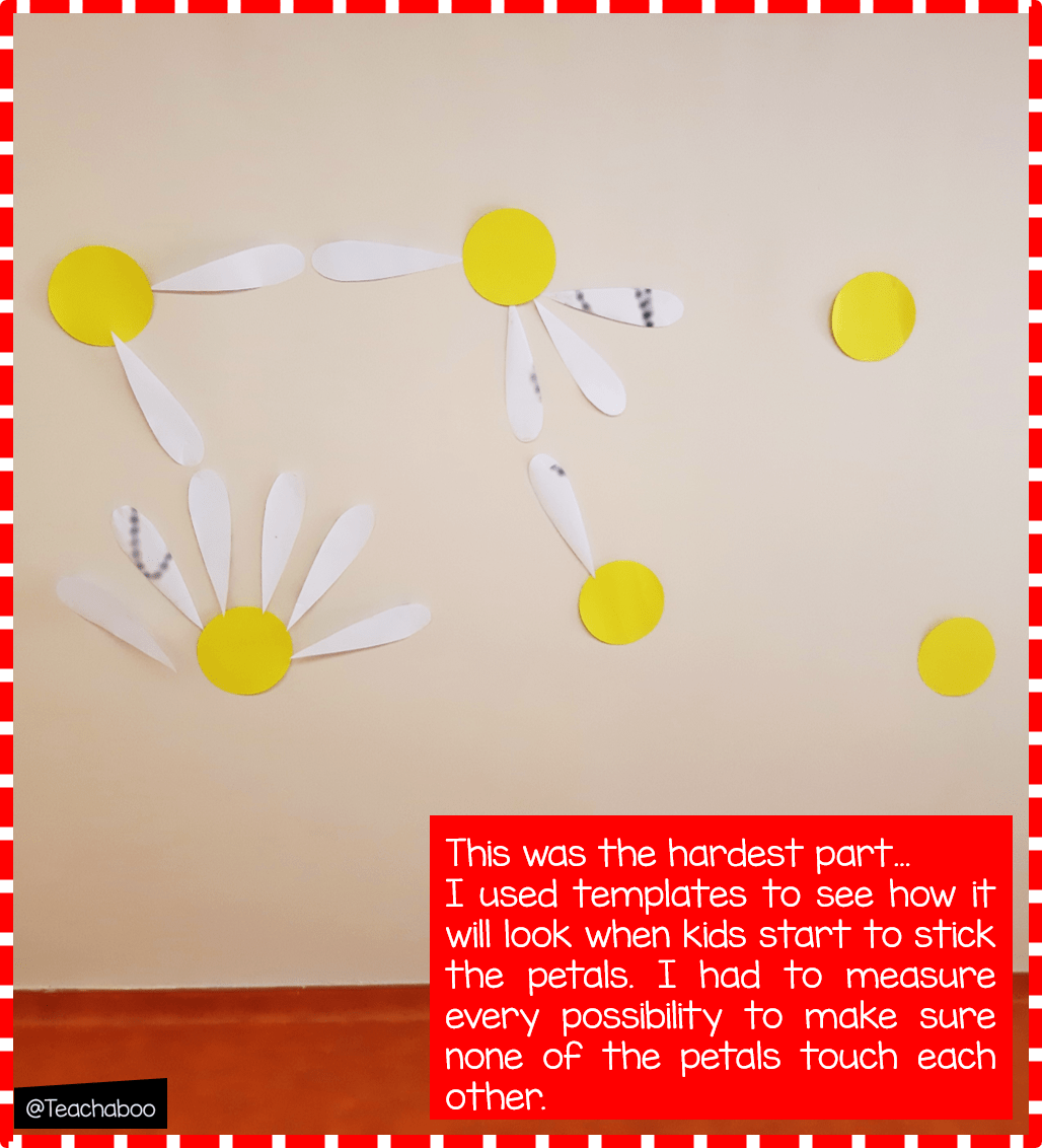 Kids come to school and find their “Petals” which is on the wall. Then, stick them on the flowers and create a colorful flower garden.